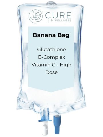 The Banana Bag with High dose Vitamin C IV delivers a potent combination of B vitamins, Glutathione, and Vitamin C to boost immunity, rehydrate, and enhance recovery.